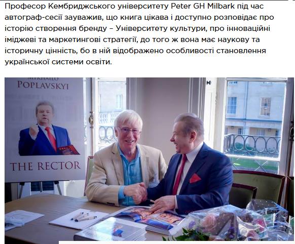 Нещодавно на українських сайтах новин з’явилися дуже «джинсові» публікації про те, що Михайло Поплавський — ректор КНУКіМ і поганий співак — презентував свою книгу «Ректор» у Кембриджському університеті.