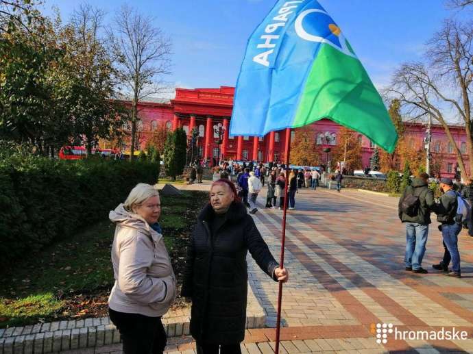 На вопрос журналиста Громадського о цели этого митинга компания людей с флагом Аграрной партии ответила: "Ну, это же Аграрная партия. Поэтому стоим за землю".