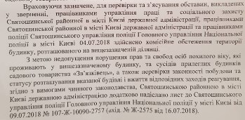 Еще одна жалоба поступила в управление полиции 14 августа 2018 года. Криминальным производством занимается следователь Святошинского района Карпенко Вадим Олегович. По его словам, на данный момент проводится досудебное расследование, сбор доказательств, проверка причастности тех или иных лиц к правонарушению.