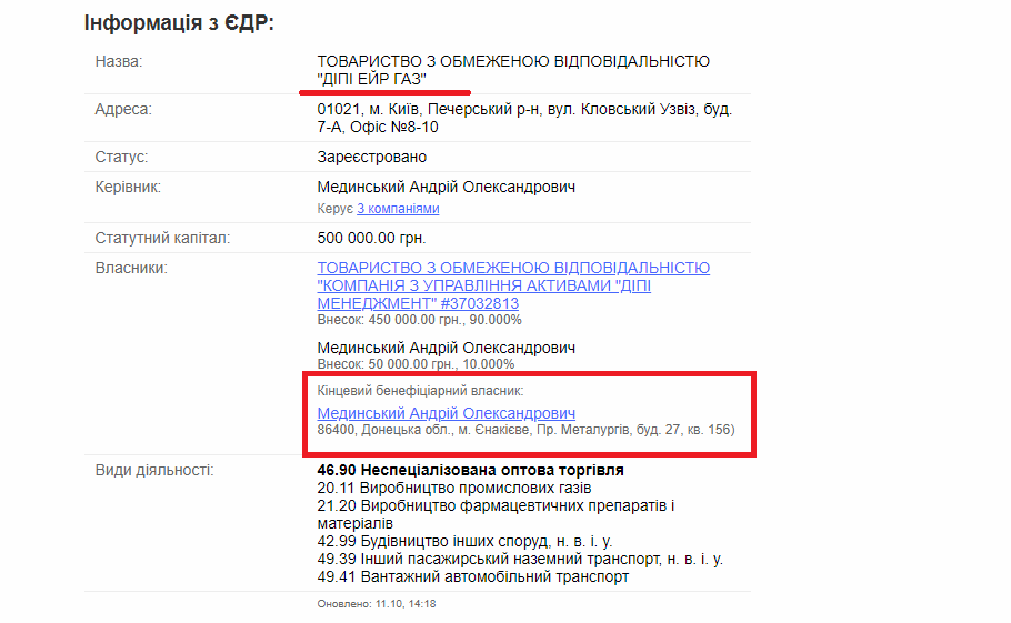 Его основной бизнес – группа DP (аббревиатура базовой компании Мединского «Дары природы» из Дружковки), в которой ключевое место занимает ООО «ДиПи Эйр Газ» (DP Air Gas). Эта структура, директором и бенефициаром которой является Мединский, называет себя «национальным лидером по производству и дистрибуции сжатых промышленных газов и газовых смесей в Украине» (по оценкам «ОЛИГАРХА», оборот «ДиПи Эйр Газ» в 2017 г составил около 75 млн гривен) и снабжает продукцией многие госструктуры. Например, на днях «ДиПи Эйр Газ» подписал контракт на поставку сжиженного природного газа на Чернобыльскую АЭС и выиграл тендер на поставку медицинских газов больнице «Феофания» Государственного управления делами. Впрочем, у медали есть и другая сторона. Как писал «ОЛИГАРХ», в прошлом году СБУ заподозрила, что «ДиПи Эйр Газ» «осуществляет действия, направленные на финансирование или материальное обеспечение террористических организаций «ДНР»-«ЛНР» и уклонения от уплаты налогов в госбюджет Украины.