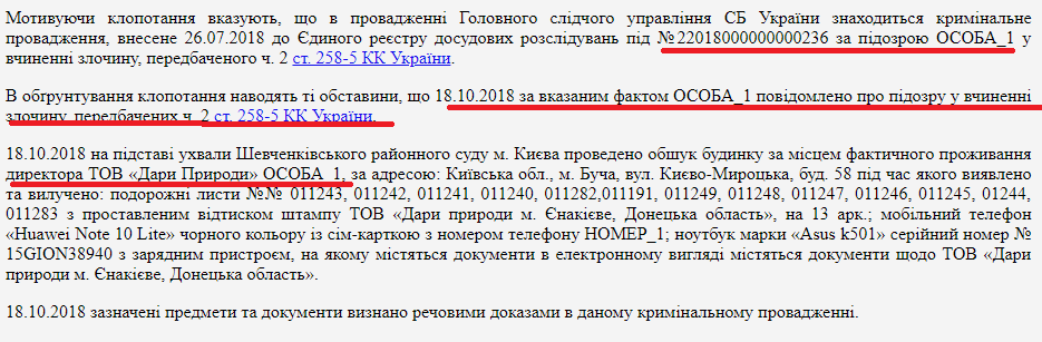 О том, что все серьезно, говорит перечень обнаруженной спецслужбой документации. «Проведен осмотр изъятых документов, по результатам которого установлено, что они содержат данные о деятельности на неподконтрольной Украине территории Донецкой области ООО «Дары Природы» (ИНН т.н. «ДНР» 50008939), расположенного в г. Енакиево, которое осуществляет финансирование террористической организации «ДНР», и его основателя ООО «Спецсервис» (РФ, Ростовская область, г. Таганрог, ул. Александровская, д. 34)…18.10.2018 указанные документы признаны вещественными доказательствами в данном уголовном производстве» – указали следователи СБУ.