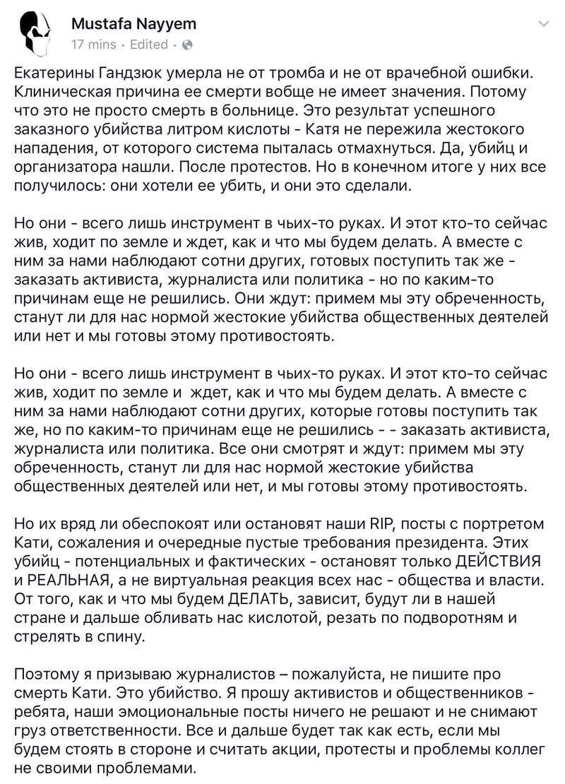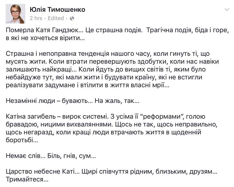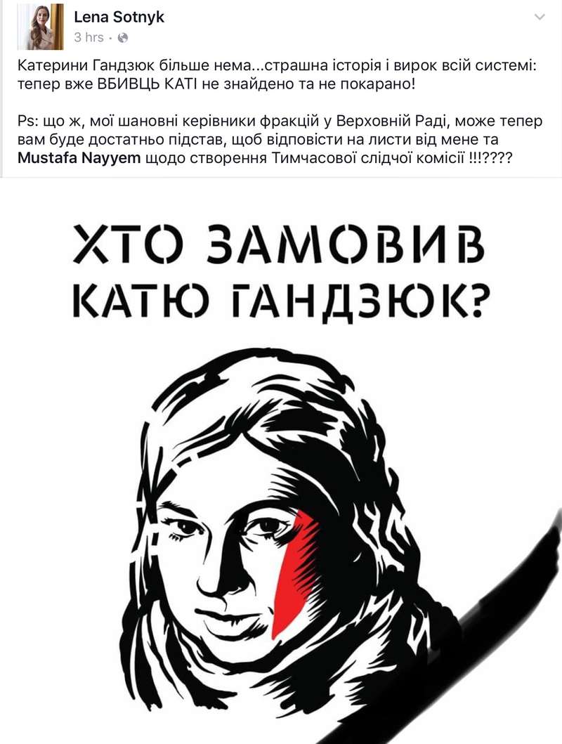За несколько месяцев до этого, в июле, девушку облили серной кислотой, в результате чего она получила более 30% ожогов кожи. Воскресным вечером в Украине прошли акции памяти Гандзюк. Пользователи социальных сетей также бурно отреагировали на гибель девушки. FaceNews собрал реакции.