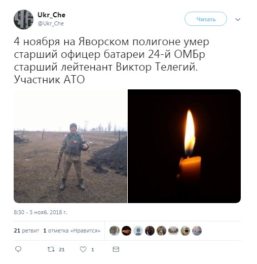 “4 ноября на Яворском полигоне умер старший офицер батареи 24-й ОМБр старший лейтенант Виктор Телегий”, – говорится в подписи к фото.