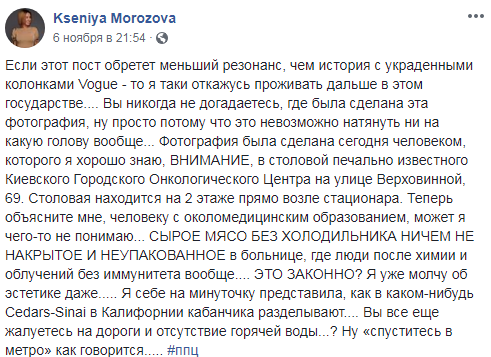 “Вы никогда не догадаетесь, где была сделана эта фотография, ну просто потому что это невозможно натянуть ни на какую голову вообще…”, – написала она. Также девушка уточнила, что торговлю сырым мясом устроили в столовой, которая находится на 2 этаже около стационара. “СЫРОЕ МЯСО БЕЗ ХОЛОДИЛЬНИКА НИЧЕМ НЕ НАКРЫТОЕ И НЕУПАКОВАННОЕ в больнице, где люди после химии и облучений без иммунитета вообще…. ЭТО ЗАКОННО? Я уже молчу об эстетике даже…”, – возмутилась Ксения.