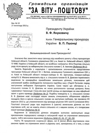 Після нових вимог пана Витязя про виділення землі силовикам громадська організація "За Віту-Поштову" поскаржилася на ненаситного прокурора і його подільників президенту Януковичу і генеральному прокурору Пшонці: "Благаємо Вас захистити нашу громаду від нахабного рекету з боку прокуратури Київської області, Головного управління СБУ у м. Києві та Київській області, УДБЕЗ ГУ МВС України в Київській області, які всебічно "опікають" Віто-Поштову сільську раду після арешту за хабарництво сільського голови С. В. Іванова. Замість боротьби з корупцією і організованою злочинністю представники прокурора Київської області М. І. Витязя, начальника Головного управління СБУ у м. Києві та Київській області генерал-майора О. Ю. Щеголєва, генерал-майора міліції В. Б. Мазана вимагають від в. о. сільського голови В. В. Довганя термінового виділення їм комерційно привабливих земельних ділянок, пояснюючи цей узаконений грабіж необхідністю поповнити партійну касу "Партії Регіонів" перед наступними виборами Президента України".