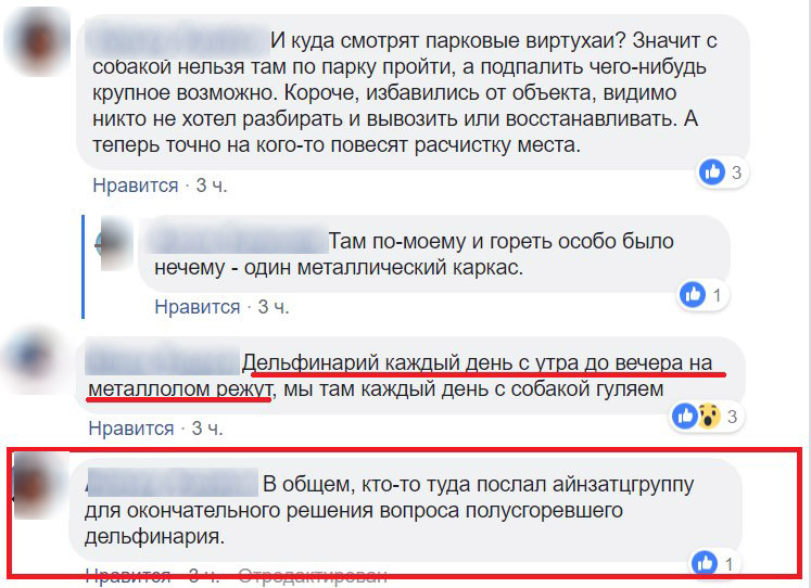 «Дельфинарий 7 числа обрезали трубы, стойки и снесли трактором, обещают с нуля сделать новый дельфинарий. Никакого пожара там не было», — отметил еще один дончанин.
