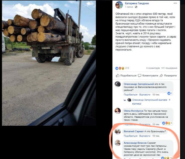 Останній скандал з обласною владою стався в червні поточного року. Тоді Катерина вголос говорила про масштабну пожежу в Олешківському районі неподалік Херсона. Катерина говорила про те, що це традиційна схема – ліс підпалюють, а потім, те, що не згоріло вщент – вирубують і продають. Дуже зручно, адже офіційно лісу не існує, а це означає, що не потрібні дозволи, податки, деревину продають і мають чистий прибуток. Внаслідок останньої пожежі було знищено близько 600 гектарів лісу. За чутками спалити мали 50, в рамках корупційної норми, але все вийшло з-під контролю. Винних не знайшли, але факт підпалу в МВС визнали. У себе в ФБ Катерина публікувала фото з фурами, які вивозять деревину зі слідами пожежі, і вголос називала тих, кого підозрює в злочині - Владислава Мангера і Андрія Гордєєва.