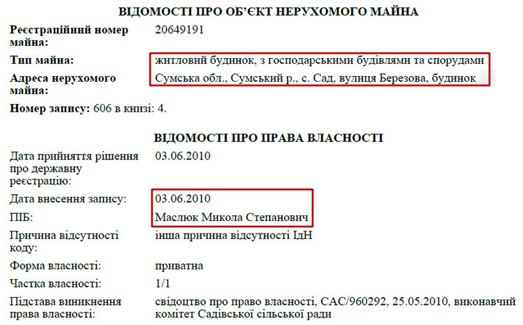 Серед іншого нерухомого майна у власності прокурора дві квартири, гараж та земельна ділянка в Сумах. Цікаво, що однією з квартир він володіє разом із своєю дочкою Анною Олександрівною Маслюк, яка працює прокурором Сумської місцевої прокуратури. У власності нинішньої дружини прокурора лише одна земельна ділянка в Сумах. Її площа 1000 кв.м.