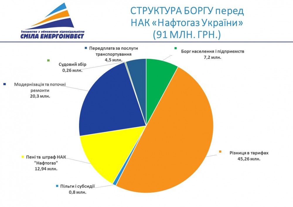 На официальном сайте НАК «Нафтогаз» указано, что задолженность «Смела Энергоинвесту» за газ составляет 89 миллионов гривен . На самом предприятии уверяют, что большая часть долга – это просто невозмещенная государством разница в тарифах частично – пеня от «Нафтогаза» и долги населения. Впрочем, правоохранители думают по-другому.