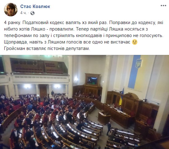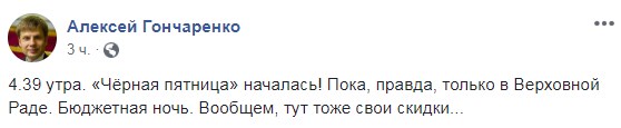 "4.39 утра. "Чёрная пятница" началась! Пока, правда, только в Верховной Раде. Бюджетная ночь. Вообщем, тут тоже свои скидки..." - пишет Алексей Гончаренко.