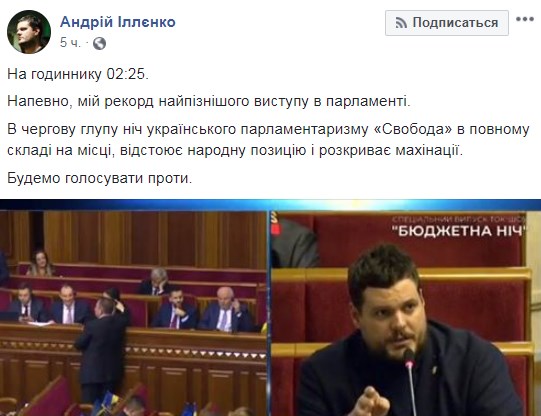 "На часах 2:25. Наверное, мой рекорд позднего выступления в парламенте. В очередную глухую ночь украинского парламентаризма "Свобода" в полном составе на месте, отстаивает народную позицию и раскрывает махинации. Будем голосовать против", - написал он.