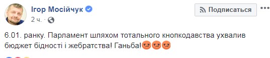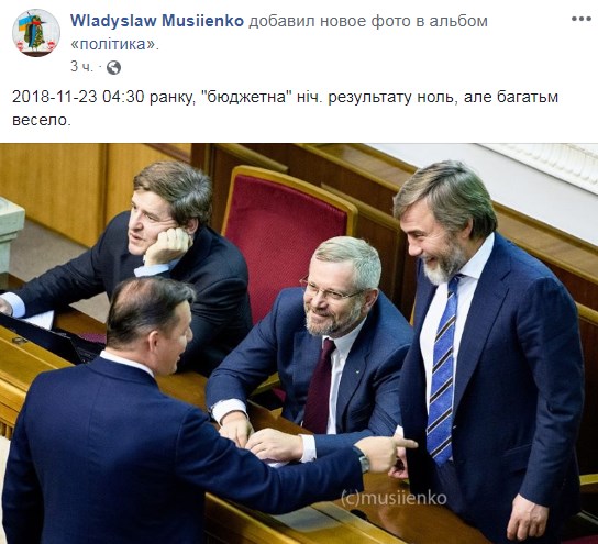 "В 5:16 утра украинский парламент рассматривает проект главного финансового документа страны - государственный бюджет. В зале стоит стойкий запах алкоголя, нардепы спят, а те кто не спит то мало, что понимает... Одним словом - ШУЛЕРСТВО!", - пишет нардеп от РПЛ Игорь Мосийчук.
