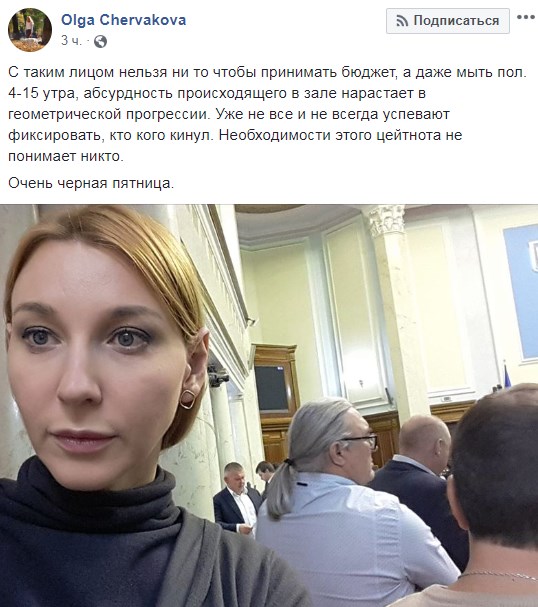 "С таким лицом нельзя не то чтобы принимать бюджет, а даже мыть пол. 4-15 утра, абсурдность происходящего в зале нарастает в геометрической прогрессии. Уже не все и не всегда успевают фиксировать, кто кого кинул. Необходимости этого цейтнота не понимает никто. Очень черная пятница", - отметила Ольга Червакова.