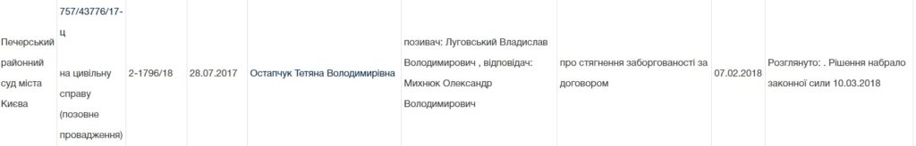 07 лютого 2018 року Печерський районний суд Києва ухвалив стягнути заборгованість за цим договором.