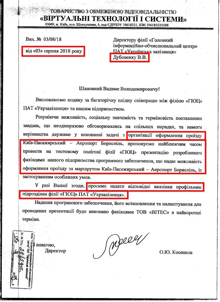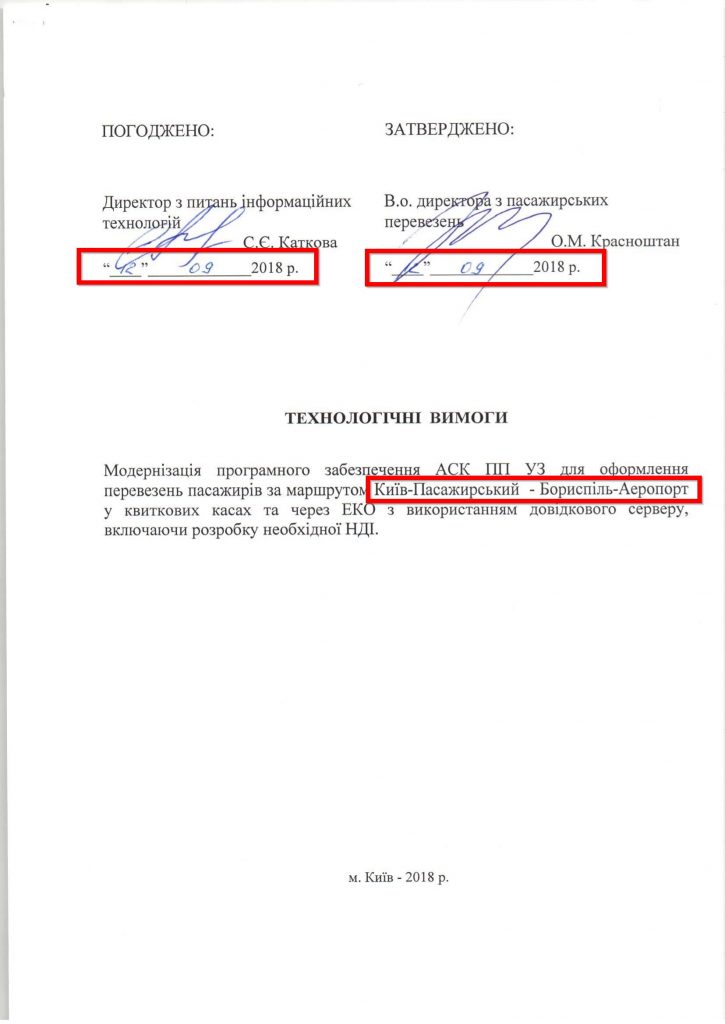 12.09.2018 руководство Департамента информационных технологий (Каткова С.Е.) и Департамента пассажирских перевозок (Красноштан А.Н.) утверждают «Технологические требования на систему продажи билетов на маршруте Киев – аэропорт Борисполь».