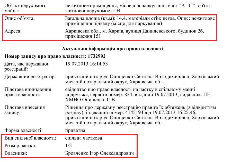 Также в собственности Игоря Александровича находятся помещения технического этажа на 114 кв. м в Харькове. И хотя право собственности на недвижимость приобретено еще в далеком 2006 году, ни в одной из бумажных деклараций его не было. К тому же помещение приобретено в собственность на основании решения Дзержинского райсуда Харькова, предыдущего места работы Бровченко.