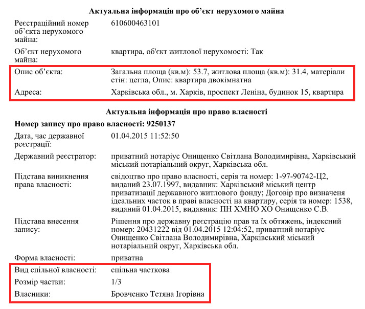 Дочь Татьяна Бровченко живет в Харьковской квартире на 53 кв. м. Жилье приобретено на основании свидетельства Харьковского городского центра приватизации служебного фонда.