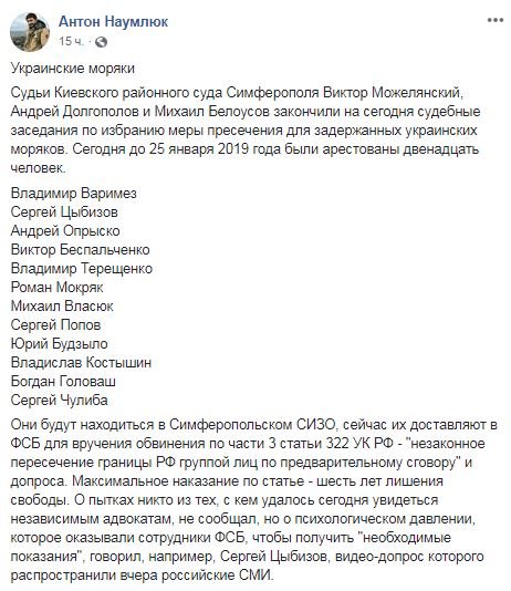 Сначала “суд” в Симферополе избрал “меру пресечения” в виде содержания под стражей до 25 января для 12 украинцев: Владимир Варимез, Сергей Цыбизов, Андрей Опрыско, Виктор Беспальченко, Владимир Терещенко, Роман Мокряк, Михаил Власюк, Сергей Попов, Юрий Будзыло, Владислав Костышин, Богдан Головаш, Сергей Чулиба.