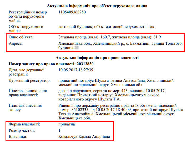 Также судья Альбина Ковальчук декларирует дом на 349,4 кв. м в Хмельницком. По состоянию на дату приобретения права собственности оценочная стоимость помещения составляла 1 078 376 грн. Судья утверждает, что дом построен на средства семьи, особенно с помощью отца Мошковского Николая Ивановича, руководителя ЗАО «Хмельницьке БМУ – 69».