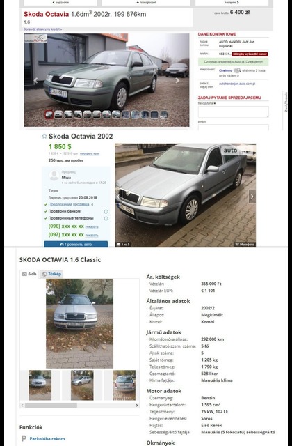 «VW Passat» B5 2000 года выпуска с дизельными мотором 1,9 и с пробегом в 325000 километров у нас стоит 1950 евро. Подобная машина в Венгрии будет стоить 1700 Евро, а в Польше 1350 Евро. За такую же машину уже на украинском номерах нужно будет отдать около 4500 Евро. Попробуем растаможить венгерский вариант. Получается 1890 Евро без учета НДС и уплаты в Пенсионный Фонд и в льготный период. 16-летнюю Октавию с бензиновым мотором на «евробляхах» пытаются продать в интернете за 1650 Евро. Точно же такой «железный конь» в Венгрии обойдется в 1100 Евро, а вот в Польше «Skoda» ценится лучше и стоимость авто может достигать до 1500 Евро. Если растамаживать автомобиль из Польши, то он обойдется дополнительно в 1200 евро (без НДС и ПФ) в льготный период. Уже растаможена автомобиль в Украине стоит от 4000-4500 евро.