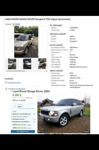 Внедорожник «Land Rover Range Rover» выглядит мега солидно. Несмотря на свой 14 возраст этот «джип» с трех литровым мотором заставит завидовать не одного соседа. За такое удовольствие на «евробляхах» просят 8300 евро. В Венгрии такое же удовольствие обойдется в 7600 евро. А вот на польских сайтах подобной комплектации мы не нашли, а младшие машины стоят примерно в 8000. Попробуем растаможить авто, которое уже находится в Украине. Такое авто обойдется еще в половину цены, а именно в 4500 Евро. На украинском регистрации по внедорожник просят чуть меньше 14 000 Евро.