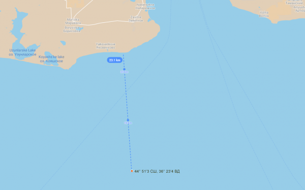 Как видно по результатам геолокации, применение оружия пограничным сторожевым кораблем ФСБ России "Изумруд" было произведено тогда, когда украинский катер "Бердянск" находился в 23,1 км от ближайшей точки на берегу, т.е. за пределами 12-мильной полосы незаконно объявленного российскими властями "территориального моря". Захват обоих украинских катеров и буксира также были произведены за пределами такой "государственной границы", т.е. в нейтральных водах даже в случае допущения признания оккупированного Крыма российским и установленных оккупантом границ нелегального "территориального моря".