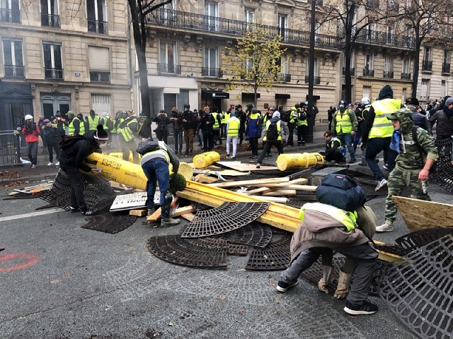 Как можно увидеть на фотографиях, протестующие возводят на улицах Парижа баррикады и жгут костры.