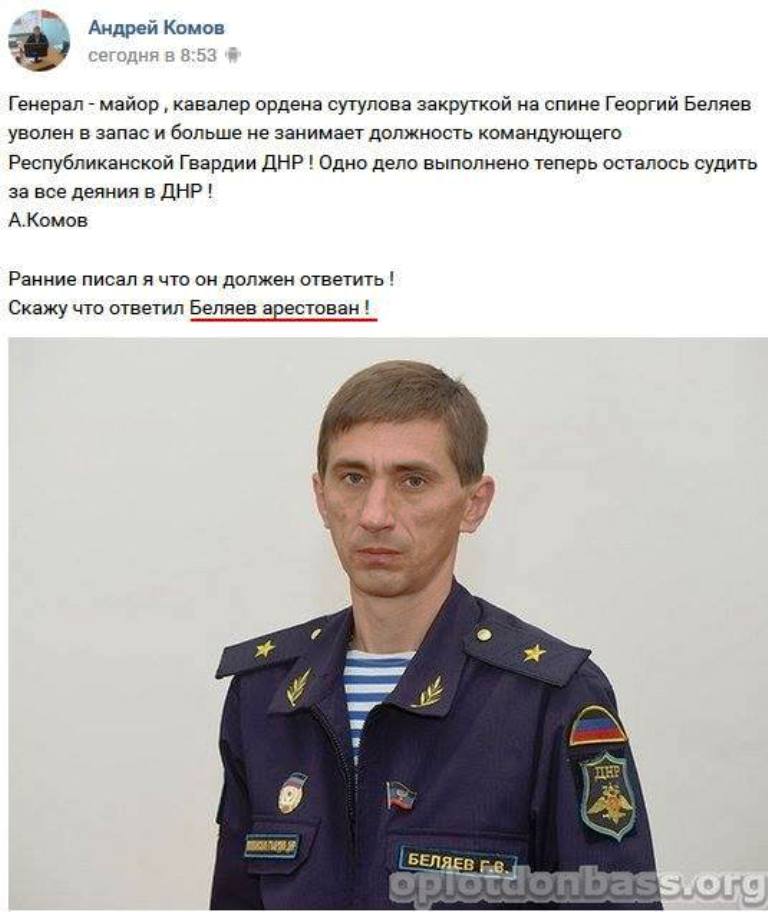 По данным членов НВФ, командир «республиканской гвардии ДНР» Григорий Беляев был арестован. Такую информацию сообщил экс-участник подразделений «ДНР» Андрей Комов.