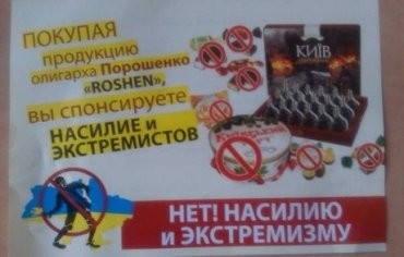 В другой листовке говорится: «Наш вклад в мир и согласие будет, если мы перестанем покупать продукцию компании «Roshen» Петра Порошенко. Тем более что с признанием ее качества были проблемы в Российской Федерации».