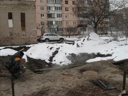 Но, оказывается, нынче в Киеве не все так просто. В моем случае было так. Сначала приехали добрые молодцы, дышащие огненной водой, которые давай землю-матушку долбить. Докопались они до ржавых труб, скрутили их жестко проволокой и бросили. Уже и сентябрь с октябрем прошли, потом ноябрь канул в Лету, декабрь холодный наступил, а трубы все не укрытые, "окопы" не зарытые.