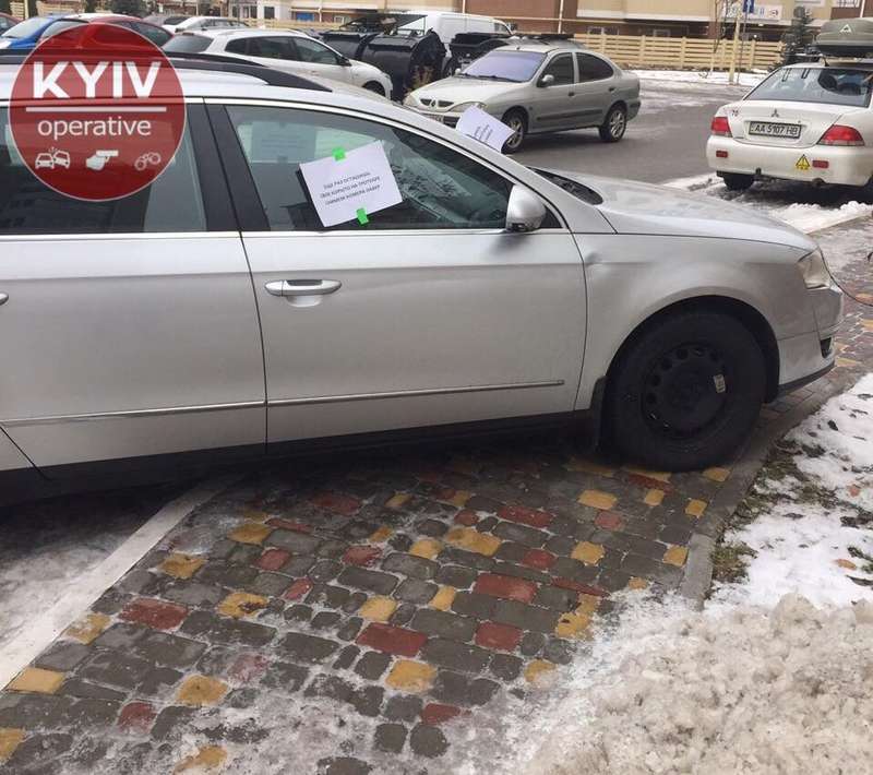 Гневные записки разозленные киевляне наклеили на лобовом и боковых стеклах транспортного средства. Таким образом они решили предупредить владельца автомобиля, который оставляет свое авто на тротуаре, чем мешает пешеходам ходить.