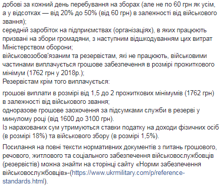 – военнообязанным и резервистам, которые не работают, военными частями выплачивается денежное обеспечение в размере прожиточного минимума (1762 грн в 2018 г.).