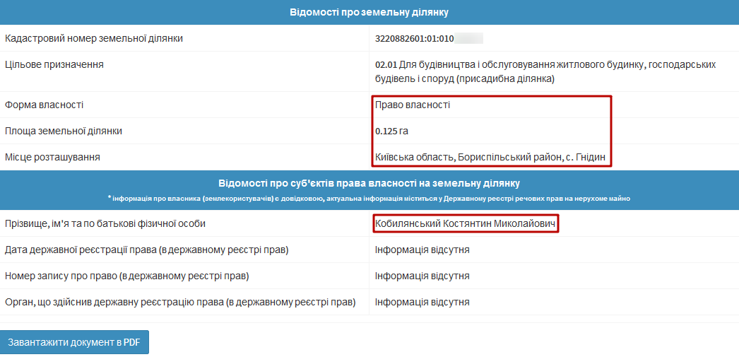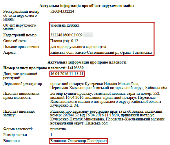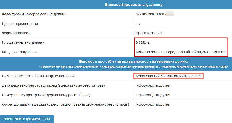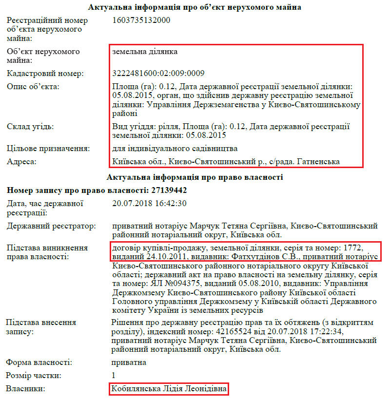 У власності Костянтина Миколайовича Кобилянського є два гаражі у Києві та земельна ділянка в смт. Немішаїве. Цікаво, що на кадастровій карті її площа 0.1051 га, а в декларації — 0,1047 га. Розташована вона у місці, де вже збудовані елітні приватні будинки.