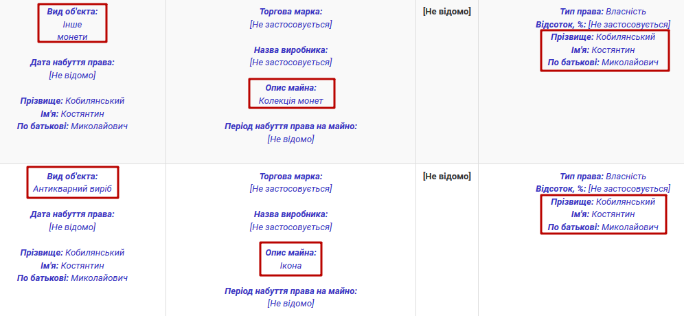 Багато у власності родини цінного майна. Так, зокрема, Костянтин Миколайович Кобилянський є власником колекції монет та ікон. У власності його дружини є дві золоті каблучки з камінням, золоті сережки з камінням, годинник та картина.