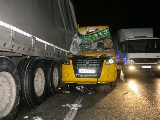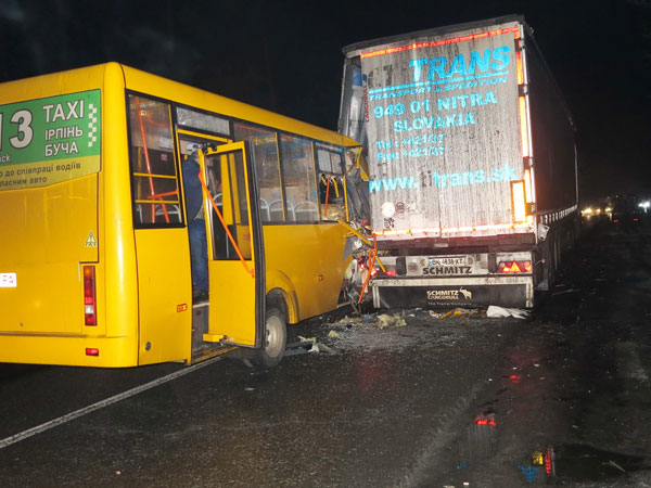 Примерно в полутора километрах от поворота на Пуща-Водицу маршрутка с людьми, направляющаяся в сторону населенного пункта Буча на полном ходу врезалась в остановившийся в правом ряду грузовик — объект достаточно габаритный, со светоотражающими элементами.