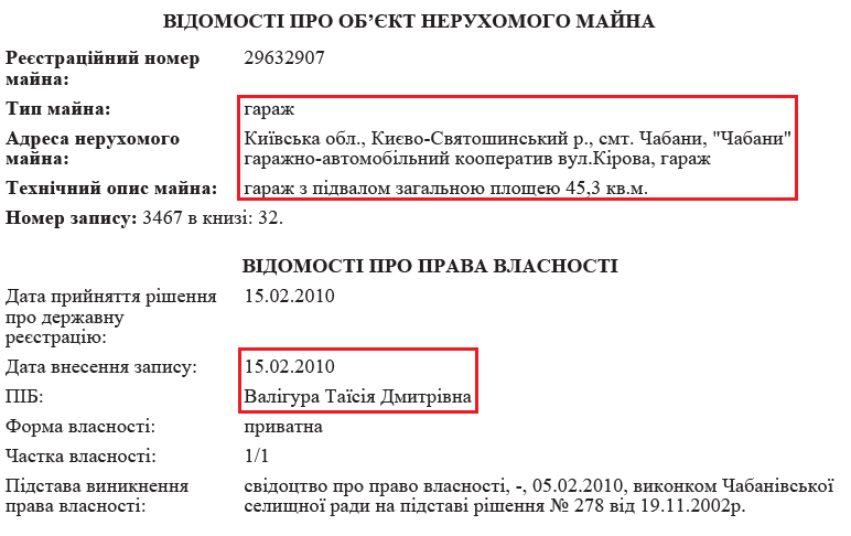 Окрім вищезгаданого будинку, матір судді є власником іншого майна. Таїсія Дмитрівна володіє гаражем у Чабанах. Його площа 45 кв. м. Також у власності Таїсії Валігури земельні ділянки в Чабанах та Гатному. До речі, на співбесіді суддя повідомив, що одну із земельних ділянок в Гатному його матір придбала за 270 тис. грн у 2006 році. Нагадаємо, все життя вона пропрацювала вчителем.
