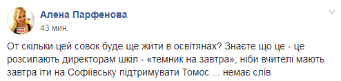 По данным пользователя FB Алены Парфеновой, написавшей в паблик "Батьки SOS", темник рассылают директорам школ. Учителей обязывают прийти в субботу, 15 декабря, на Софийскую площадь "чтобы поддерживать Томос".