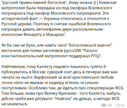 “Хотя я и являюсь митрополитом Вселенского патриархата, я совершенно не согласен с позицией, которую занял патриарх Варфоломей. Со всем должным уважением к моему патриарху я обязан сказать, что я согласен с выраженным Московским патриархатом мнением, что Украина относится к Русской церкви”, — выразился Каллист.