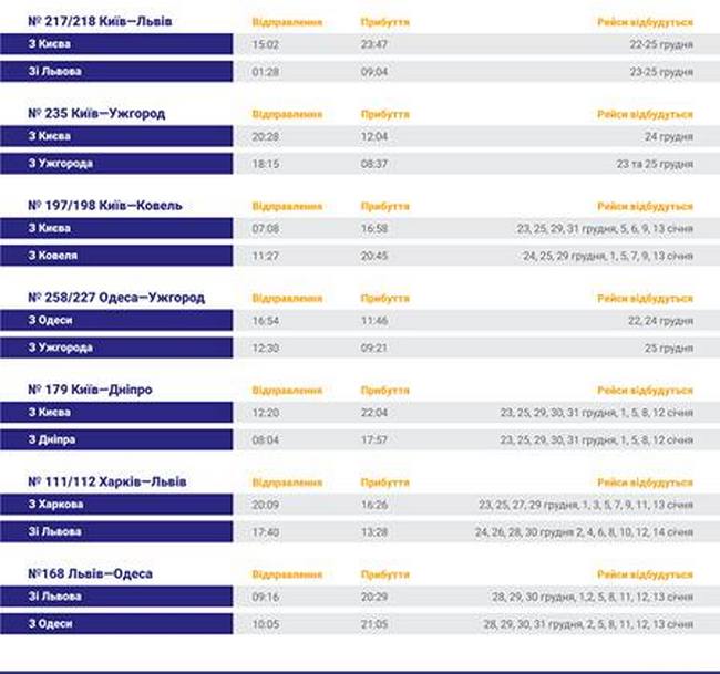 Для перевозки пассажиров в период новогодних и рождественских праздников «Укрзалізниця» открыла продажу еще на пять дополнительных поездов из Киева. Они отправятся в Ужгород, Львов, Ковель и Днепр. Также добавился один поезд на рейс из Одессы в Ужгород.