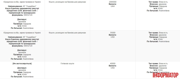 Дружина політика Юлія Бурдужа задекларувала ще менші заробітки: 185 500 гривень доходу від заняття підприємницькою діяльністю та 32 248 гривень зарплати.