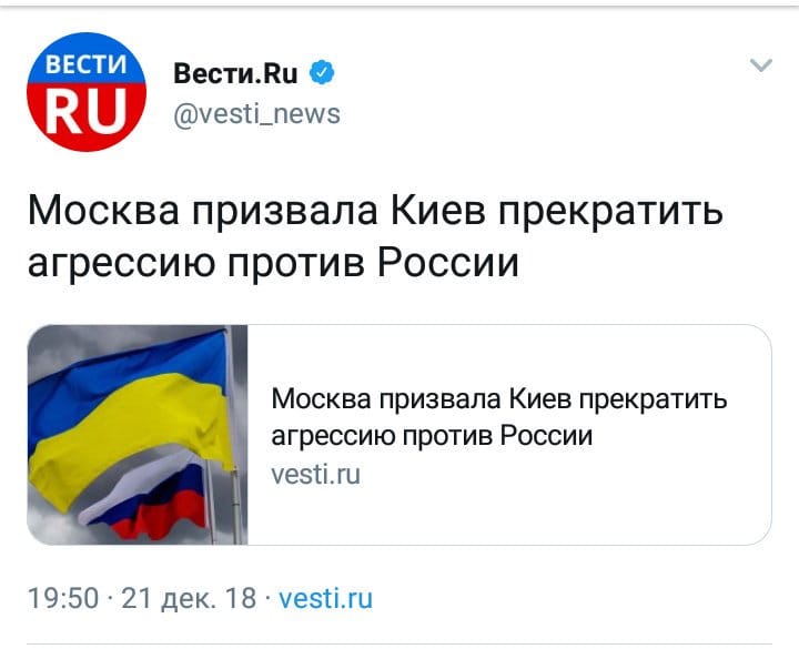 Об этом сообщает офицер ВСУ Анатолий Штефан “Штирлиц” на своей странице в Facebook. Также он разместил скриншот материала с росСМИ. “Москва призвала Киев прекратить агрессию против России”, – гласит заголовок российского издания “Вести.ru”.