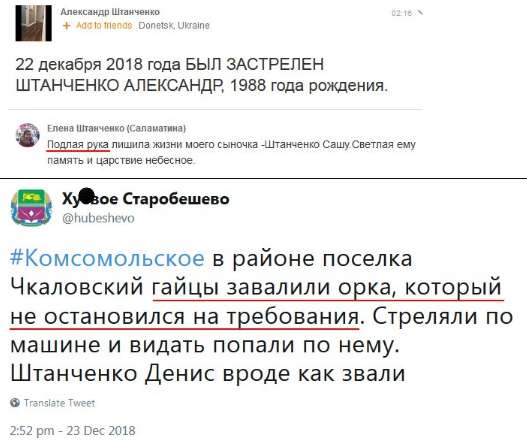 “Штанченко Александр Александрович (Комсомольское, 14/10/88) застрелен “гаишниками” Т1 в Комсомольском”, – написал он.