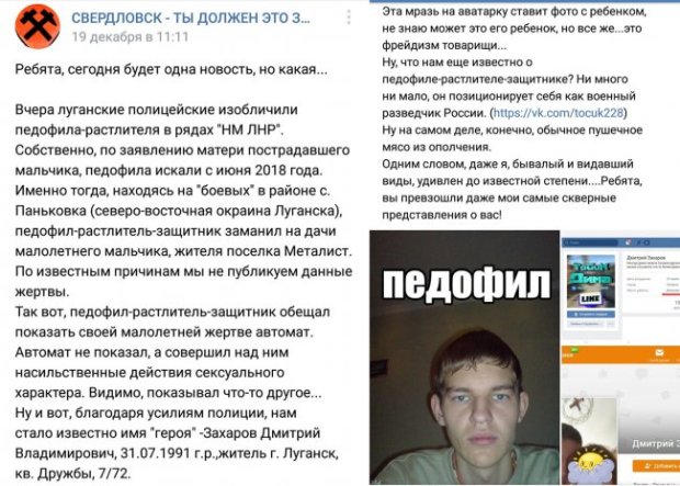 “Педофилы в рядах оккупационных войск “Л/ДНР”. Меня даже не удивило, что весь сброд собрался в одном месте и называют себя “защитники отечества”, а сами тем временем воплощают свои извращенные фантазии и мечты”, – написал он и добавил, что это уже не первый случай в рядах боевиков.