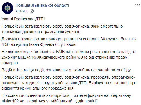 “Неизвестный водитель автомобиля BMW на иностранном регистрации совершил наезд на 25-летнюю жительницу Жидачевского района, которая от полученных травм скончалась. Водитель скрылся с места происшествия, оставив автомобиль неподалеку наезда, – сообщили в полиции.