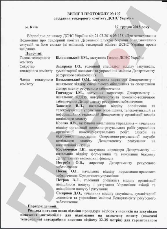 Замовник провів у грудні два тендери з придбання 10 пожежно-рятувальних автомобілів та трьох пожежних телескопічних автодрабин. 19 грудня ДСНС оприлюднила намір укласти угоди з переможцем торгів ТОВ «Промислова компанія «Пожмашина» (Чернігівська область).