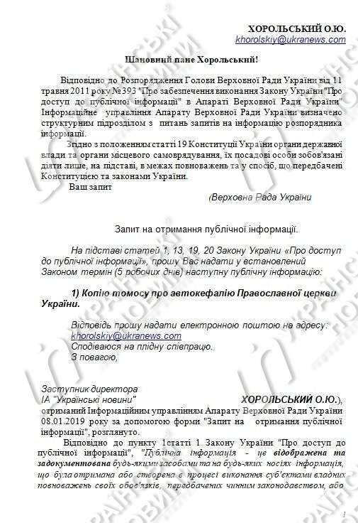 "...информируем, что в соответствии с распоряжением председателя Верховной Рады Украины от 11 мая 2011 года №393 "Об обеспечении выполнения Закона Украины "О доступе к публичной информации" в Аппарате Верховной Рады Украины", Аппарат Верховной Рады Украины не является распорядителем информации по запросам на информацию относительно информации органов власти других государств, международных организаций", - сказано в ответе Рады.