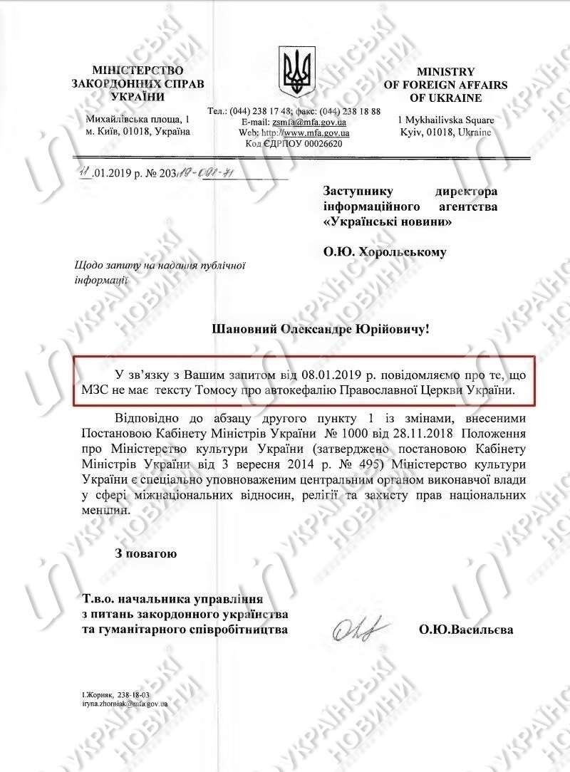 "В связи с Вашим запросом от 08.01.2019 года сообщаем о том, что МИД не имеет текста Томоса об автокефалии Православной церкви Украины", - указано в ответе МИДа.
