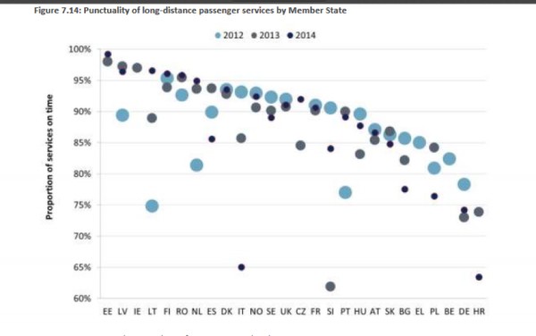 По официальной статистике, в 2017 году прибыли вовремя 98,5% пассажирских и 96,9% пригородных поездов. В то же время, в большинстве стран ЕС опоздания поездов - норма. Например, согласно официальной статистике немецкого «Deutche Bahn», в 2017 году вовремя прибыло 78,5% пассажирских поездов и 94,4% пригородных. А согласно разработанному по заказу Еврокомиссии отчету «Исследование цен и качества железнодорожных пассажирских услуг», пунктуальность более 95% среди пассажирских поездов имеют лишь 6 стран ЕС!