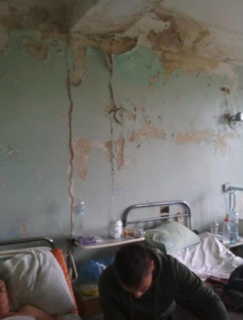 На фотографии палаты видно треснутые стены, открытую проводку, отсутствие розеток, отвалившуюся штукатурку и другие недостатки, которых быт не должно, особенно в больнице.