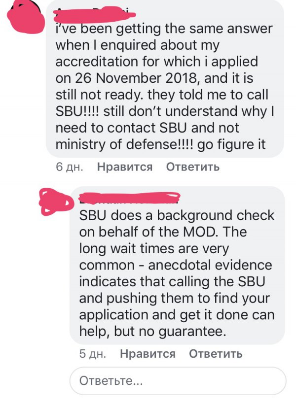 – Я отримував таку саму відповідь, коли запитував про свою акредитацію, на яку подав заявку 26 листопада 2018 року, й вона ще не готова. Вони сказали мені звернутися до СБУ!!! Досі не розумію, чому мені потрібно звертатися до СБУ, а не до Міністерства оборони!!! Піди та з’ясуй.